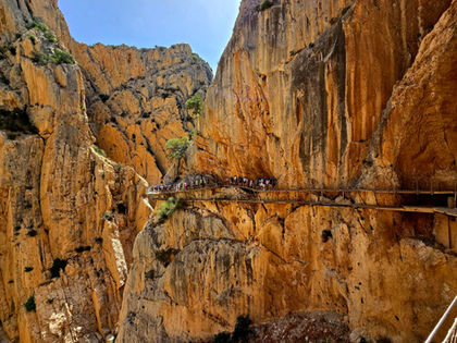 The Caminito del Rey is a spectacular walkway located in the Desfiladero de los Gaitanes gorge near Málaga, Spain. Over decades, the path fell into a dangerous state of disrepair, gaining a reputation as "the world's most dangerous walkway" and attracting thrill-seekers until it was closed following several fatal accidents. After a full restoration, the Caminito del Rey reopened in 2015 as a safe and accessible tourist attraction. It now offers a breathtaking 7.7-kilometer route with a new wooden boardwalk that hugs the sheer cliffs, suspended over 100 meters above the Guadalhorce River.
